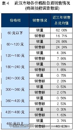 零售终端抽样数据显示,白酒60元以下和60元~120元为价格金腰带,180元~420元价格带销量比例都不足1%;480元以上和60元~120元为销售额、终端利润最高价格带,其次为60元以下价格带;120元以上价格带白酒销售呈现大幅增长。武汉市场各价格段白酒销售情况(终端抽样调查数据)(见表4)。