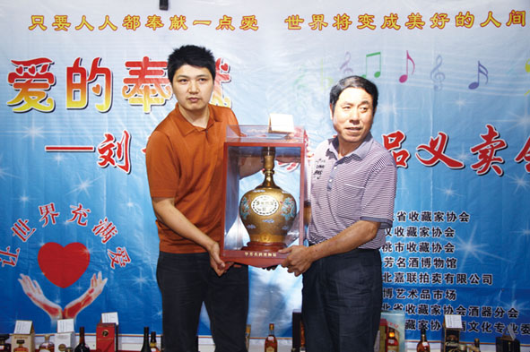 6月16日下午,由湖北省收藏家协会、武汉收藏家协会、华芳名酒博物馆等八家单位联合举办的“爱的奉献——刘千忠酒类藏品义卖会”在武汉昊博艺术品市场开拍,其中中国白酒“博大精深”收藏酒一鸣惊人,以28万元人民币成交,惊艳全场。