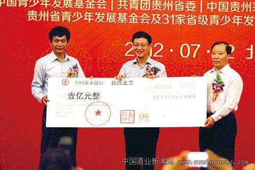 2012年7月12日,在中国青少年发展基金会、中国贵州茅台酒厂(集团)有限责任公司、共青团贵州省委、全国32家省级青少年发展基金会共同举办的“国酒茅台·国之栋梁——2012·希望工程圆梦行动大型公益助学活动”捐赠、启动仪式上,茅台集团向中国青少年发展基金会捐款1亿元人民币,面向全国31个省(区、市)及新疆生产建设兵团,按毎人5000元的标准,资助全国2万名考入二类本科以上院校、品学兼优、来自农村家庭经济困难的应届大学生。茅台集团的此次捐赠,是希望工程实施22年来一次性捐款数额最高、资助学生最多的一笔捐款。