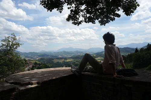 这位费德里科公爵对建筑有着狂热的执着,他在乌比诺修建的公爵宫是文艺复兴时期建筑的代表作,同时也是他个人想象力的产物。走到乌比诺城墙外的广场,眼前那座巨大而又复杂的层层叠叠的建筑,让人突然有一种时光倒流的错觉。依山势而建的乌比诺城,一侧是公爵宫恢弘的建筑及高塔,另一侧则是沿着蜿蜒的街道分布的民居。我沿着其中一条狭窄的山路往上爬,希望能从对面看到整个乌比诺城的全景。小街窄而陡峭,两侧都是用红砖或米色石块砌成的古老房舍,家家户户的窗台上都摆放着五彩的鲜花,回望来路,公爵宫的尖塔仿佛童话中的城堡一般,于狭窄的屋舍之间现出一点点身影。