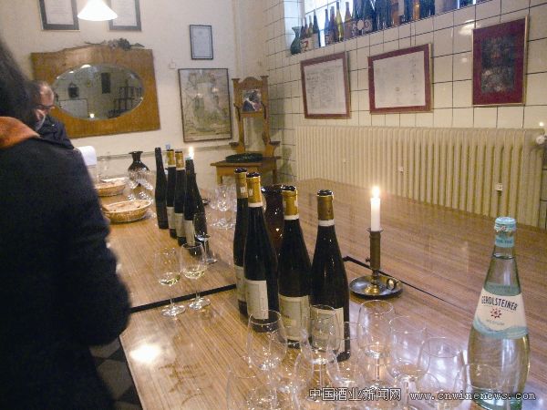 采访团此次品尝的是清一色的雷司令。《华夏酒报》记者印象最深刻的一款是 2002年份枯萄精选(Balthazar Ress Hattenheim Nussbrunnen Riesling Trockenbeerenauslese),这瓶仅375ml的莱茵高TBA,入口极甜,但均衡和谐,清爽不腻,余味悠长。它带有独特的杏子和蜂蜜味道及浓郁的果香和花香,琥珀色泽,香甜迷人,让人回味起干果的余香,并非新鲜水果的清新香气,而是可以细细咀嚼的绵长的幽香。它由采摘自2002年11月底、逐粒精选出的近似葡萄干的雷司令“浆果”酿制而成,由于糖分非常高,很难进行正常的发酵,所以要经过非常复杂的工艺,并且需要在德国最优质的橡木桶中陈年10年以上,其价格可想而知。Stefan Ress说,要得到酿制这种“贵腐”甜酒的葡萄并非易事,需要一种独特的“微气候”才能产生——早上阴冷富含水气,下午干燥炎热,而一旦天公不作美,就真的只会等到一堆烂葡萄。因此,他们每年都得看老天爷的脸色,冒着葡萄烂掉的风险,等待真正的浓缩葡萄来酿酒。