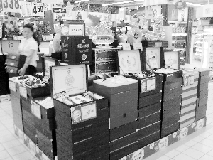 在世纪广场家乐福商场,同样也推出了买一盒,加一元送一盒的活动,店长王志林告诉记者,酒类不仅推出了加一元送一盒的活动,同时还推出了大宗购物返利活动,这是与其他商场不同的,也是和月饼的返利活动一起推出的。