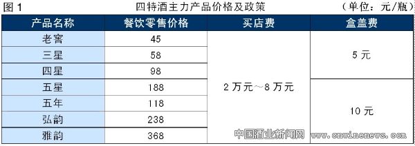 四特主力产品是五星、五年、四星、三星、老窖;铺市率很高,很少有网点是空白,消费者的自点率和忠诚度都很高。四特酒宣传形式不多,以形象广告和店招为主。对于部分销量好、位置好的餐饮店,四特也采取买断方式,以阻击百年皖酒等竞品抢店的势头(图1)。