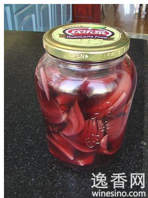 2、将洋葱装入玻璃瓶内,加入红葡萄酒,(将剥下来的外皮也一起加入效果更好)。