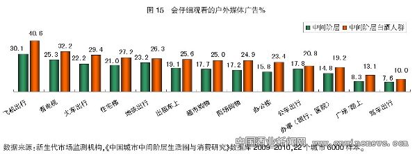 根据中间阶层白酒人群观看户外媒体广告的认真程度排行:第一梯队,会仔细看飞机、电影、火车上的广告的占比最高,但是这三类媒体广告都不是人们每天都可以接触到的;第二梯队则专注于住宅楼、地铁、出租车上的广告,会仔细看这些媒体广告的人群占比超过25%,而这三类媒体的接触频率都相对较高(见图15)。