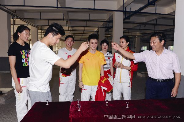 今世缘董事长、总经理周素明与伦敦奥运江苏健儿品鉴今世缘陈年原酒。