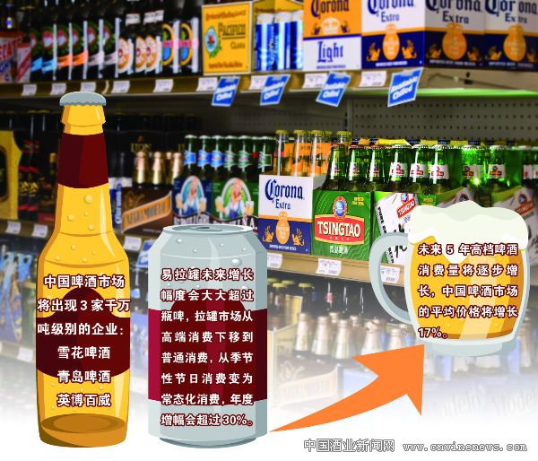 中国啤酒市场作为世界第一消费大国对于大鳄们无疑是巨大的诱惑,英博百威在中国已经达到460万千升的总销量,未来几年中,英博在中国将会有200亿元的投入,在中国市场上将有8~10个100万千升的新厂布局,目标直逼1500万千升。
