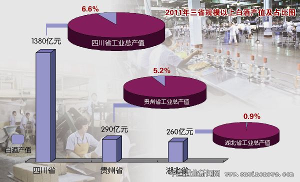 2011年,四川省规模以上白酒产值1380亿元,约占四川省工业总产值6.6%;贵州省规模以上白酒产值290亿元,约占贵州省工业总产值5.2%;鄂酒规模以上白酒产值约260亿元,仅占湖北省工业总产值0.9%。与此同时,鄂酒产量70%左右在湖北省内消化,全国市场仍存有很多空白,单一品牌销售额均在50亿元以下,无一家企业独立上市。