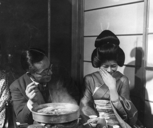 1955年,陪侍客人的艺伎腼腆地微笑。