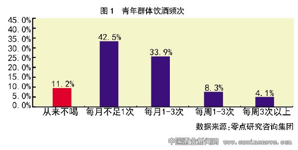 尽管青年群体目前仍不是白酒消费的主流人群,但是随着80后的参与、90后的快速增长,两大青年人群的消费活跃度逐渐显现。据零点研究咨询集团提供的数据显示,80后和90后的饮酒行为非常普遍,近九成(88.8%)的青年群体平时会饮酒,其中饮酒次数每月不足一次的占到42.5%,每月1~3次的占比为33.9%(见图1)。在品牌选择方面,高档白酒在年轻群体中的渗透率已经超过年长群体。据新生代市场监测机构中国市场与媒体研究(CMMS)调查显示,中间阶层白酒人群中,有56.1%的80后过去一年中喝过高端白酒,比例超过50后和60后。