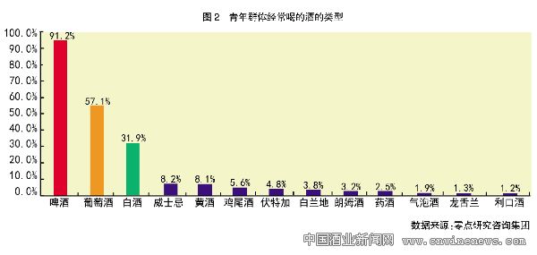 新生代市场监测机构中国市场与媒体研究(CMMS)数据显示,近3年来,中国酒类市场渗透率有比较明显的增长,2010年白酒、啤酒、葡萄酒和洋酒的总体渗透率达到52.6%。不过,零点研究咨询集团提供的数据则让白酒行业非常尴尬:在年轻饮酒群体中,超过9成经常喝啤酒,其次才是葡萄酒和白酒(见图2)。作为中国传统的酒种,白酒在年轻人中的影响力正在遭受着外来酒种和新兴酒种的侵蚀。换个角度思考,白酒对年轻消费群体的吸引和掌控不容乐观。