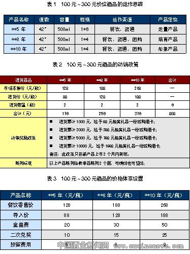 100元~300元价位带虽然市场容量巨大,但是目前行业内绝大多数企业品牌及产品尚无法运作该价位,但随着白酒行业逐步进入成熟期,未来白酒企业及经销商利润的增长将重点体现在100元~300元价位段内。因此,无论是白酒企业还是经销商,迅速占位此价格带并逐步培育出1~3款该价位段产品,将对未来发展产生爆炸性的意义。