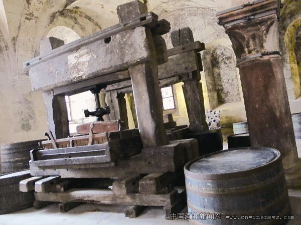 一道厚重的木门又将采访团引入了一间陈列传统酿酒器的石室。各式各样的酿酒设备,静穆地站在那里,无声地诉说着历史。在阴暗的灯光下,排列着十多件一人多高、两三米宽的木制榨汁机,都是用整块木料制作而成,在四方型的木盆上方是一块带螺纹杆的大方木,葡萄汁就是靠这块方木来压的。这间酿酒室建造于1200年,最后一次整修是在1955年。