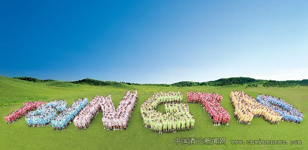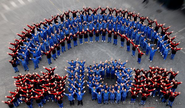 青岛啤酒员工与经销商伙伴们组成的“Tsingtao”字样,共享、共盈、共赢、共荣