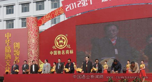上午10时,本次储酒文化节的重头“好戏”隆重开场。花冠集团的小伙子身着储酒盛装,将一坛坛封存10年之久的花冠美酒抬上主席台,在雄壮的《开缸酒》的歌曲声中,由党政领导、酿酒专家和协会领导组成的代表走上主席台,进行了隆重的开坛仪式。霎时间,储酒现场处处飘荡着美酒的芳香,人们品尝着这封存已久的花冠美酒,无不啧啧称赞。中国食品工业协会白酒专业委员会专家组组长高景炎,高高举起花冠美酒,当场赋诗一首,表达了酿酒战线上的一个“老兵”对花冠集团和花冠美酒的热情称颂。