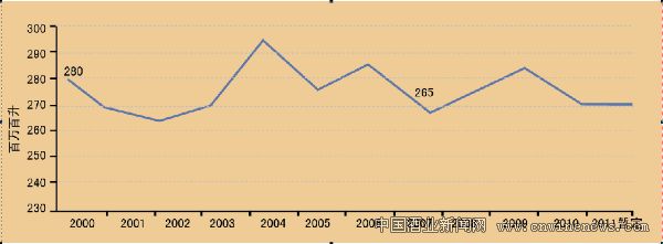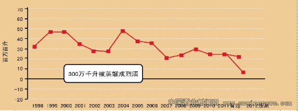 由此计算,2011年~2012年全球葡萄酒产量将下降7.8%~4.3%,取中间值约为6%,较2011年的2642万千升减少约160万千升。这是从1975年以来除1995年(2537万千升)的最低值。