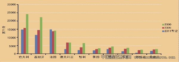 但南非的葡萄种植面积自2006年以来一直持续下降,2011年~2012年预计将减少1000公顷。澳大利亚葡萄种植面积也延续了近年来的的下降势头,预计将减少1.2万公顷。