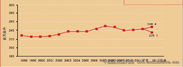 因此,我们预测2012年全球葡萄酒消费量为2357万~2494万千升。在此基础上,我们做出了关于全球葡萄酒市场平衡情况的测算。当然,产量与消费量的差别并非完全为过剩量,还有约300万千升被蒸馏成其他烈酒。从2012年来看,全球葡萄酒过剩量水平将非常低,为-59万~172万千升,也就是说,全球葡萄酒消费量可能会出现59万千升的缺口。