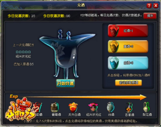对酒当歌,人生几何?梦工厂第三代页游大作,首款职场穿越武侠页游《小宝升职记》正在火热测试中,游戏新推全新“兑酒”系统,让玩家可以亲手调制各类香醇美酒痛饮,快快呼朋唤友,来《小宝升职记》痛饮美酒,醉笑江湖吧!