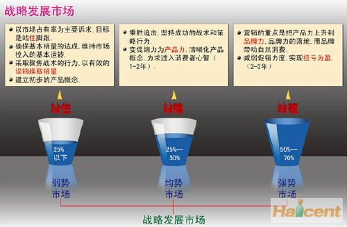 如果企业要获取竞争优势,它必须选择它所要获取的竞争优势的类型以及活动于其中的范围。“事事领先,人人满意”的想法只会导致平庸战略和低于平均水平的经营业绩,因为它常常意味着企业根本没有任何竞争优势。因此,在不同类型的市场必须有不同的关键指标,以保证所有的市场运营活动能够简单聚焦,从而完成第一层面的匹配。弱势市场的关键指标——销量突破、终端规模大幅上升,有了一定的销量和铺货率才能确保企业在弱势市场上站住脚,而不至于被轻易地清除出市场。均势市场的关键指标——心理份额的提升、产品力的落地、盈利能力的提高。形成与竞争对手势均力敌的能力必须拥有相当数量的忠诚消费者,同时还要通过产品力的提升来增加赢利产品的销量,以便消化均势市场的资源投入。强势市场的关键指标——品牌力落地、扭亏为盈的产品结构。在强势市场上企业已经从挑战者转向市场领导者地位,品牌力已经成为企业赢利的重要武器,该类市场的关键标志就是不再占用总部资源,而是输送“利润”。