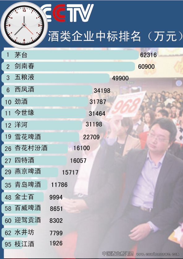 从目前公开的数据可以看出,“央视2013年黄金资源广告”招标投放额的前三位被酒企包揽,分别为:茅台为6.2316亿元,剑南春为6.09亿元,五粮液为4.99亿元。