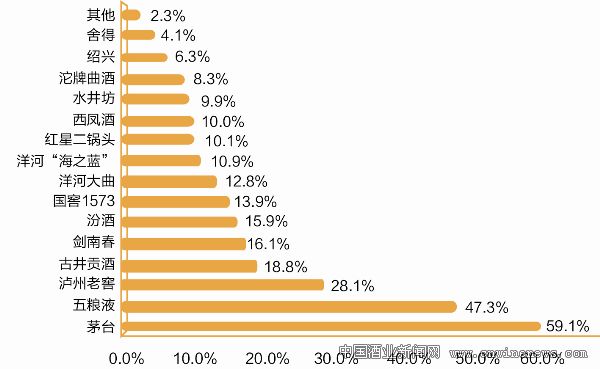 收藏市场的升温,让不少高端白酒已从餐桌转战到保险柜,一跃成为奢侈品,甚至成了部分藏家的珍贵藏品。调查发现,在收藏白酒品牌方面,茅台、五粮液、泸州老窖位列三甲。其中选择茅台的受访者占比高达59.1%,其次选择五粮液的占比为47.3%,选择泸州老窖的占比也达到28.1%,而古井贡酒、汾酒、剑南春等也是国人选择收藏的白酒之一。可以看出,由于茅台、五粮液名气大,变现流通也比别的品牌容易些,故成为消费者收藏的首选(如图2)。