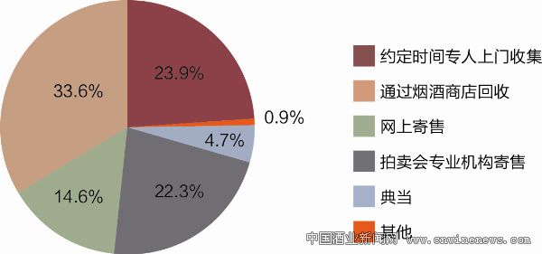 随着各大品牌的高档白酒通过涨价陆续挤入“千元阵营”后,人们也开始关注白酒变现方式。数据显示,对于出售所收藏白酒的方式选择上,33.6%的受访者表示会通过烟酒商店回收,23.9%的受访者表示会约定时间专人上门收集,另外有22.3% 的受访者会在拍卖会等专业机构进行寄售。调查发现,虽然目前收藏市场尚不规范,但是国人对白酒的投资仍充满信心,正逐步接受高档白酒以拍卖的形式进行售出(如图4)。