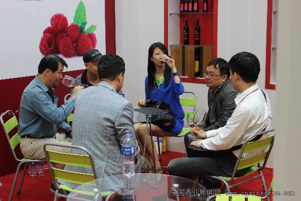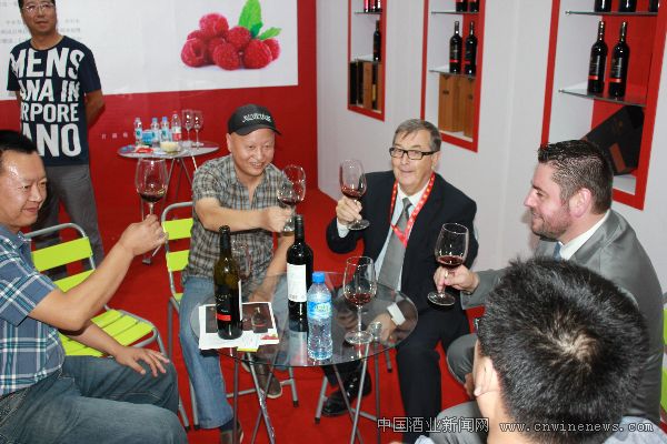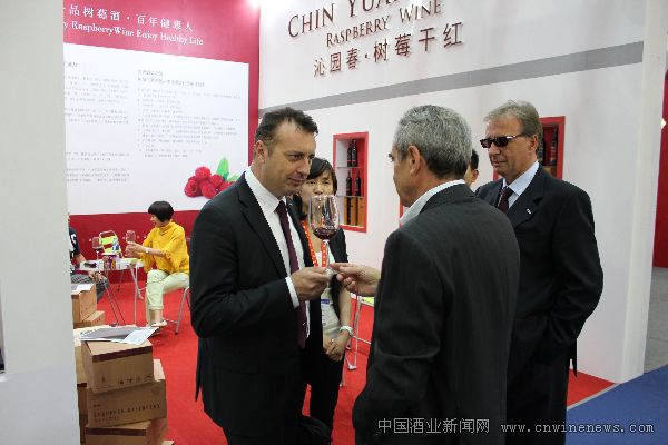 烟台沁园春公司总经理丛越平(左二)在福州全国糖酒会上,与中外嘉宾一起品赏沁园春富玉道远树莓酒。