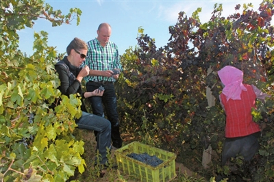 两名国外酿酒师在贺兰山下葡萄园中考察。贺兰山东麓葡萄产区已成为世界上少有的几个能生产高端葡萄酒的绝佳产区之一,吸引了不少外国酿酒企业的酿酒师前来。