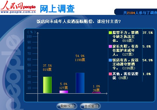 据此新闻,17日,人民网推出《饭店向未成年人卖酒面临赔偿,谁应付主责?》的网络调查。