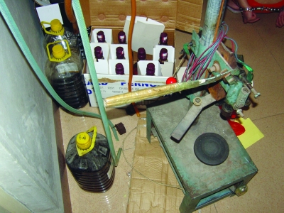 大图:被查获的各种假酒。小图:制造假洋酒的小作坊里的灌洗用具。