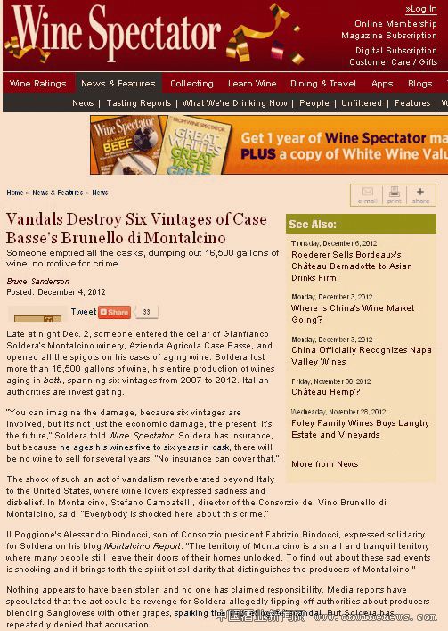 意大利托斯卡纳蒙塔奇诺地区的精品酒庄Case Basse遭到蓄意破坏,正在陈酿中的60千升2007~2012年份布鲁奈罗(Brunello)葡萄酒全部被毁。
