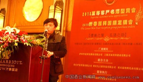 12月22日,由泸州华夏国玺酒业重庆泸玺商贸有限公司、重庆九立源商贸有限公司主办的2013年至尊客户名酒鉴赏会曁2013年新春团拜团购定货会在重庆万豪酒店隆重举行。