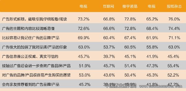 相比较而言,杂志广告更容易形成品牌印象并激发受众进一步针对广告内容进行查询。超过四成目标人群认同电视、报纸、杂志和楼宇液晶电视的公信力。
