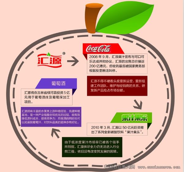 为扭转颓势,2010年3月,汇源以50亿元巨资推出了系列全新碳酸饮料“果汁果乐”,然而由于低浓度果汁市场早已被各个强手所割据,汇源拼尽全力仍无法进入行业前三强,依旧没有改变其发展的困境。