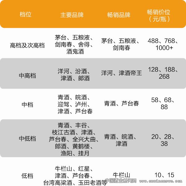 天津白酒消费档次两极分化严重,高档及次高档以茅台、五粮液、剑南春、洋河蓝色经典与津酒帝王系列为主;中高档消费则以洋河海之蓝、汾酒老白汾为主;中低档消费量巨大,以青酒、皖酒、迎驾及地产酒津酒、芦台春为主(见表1)。