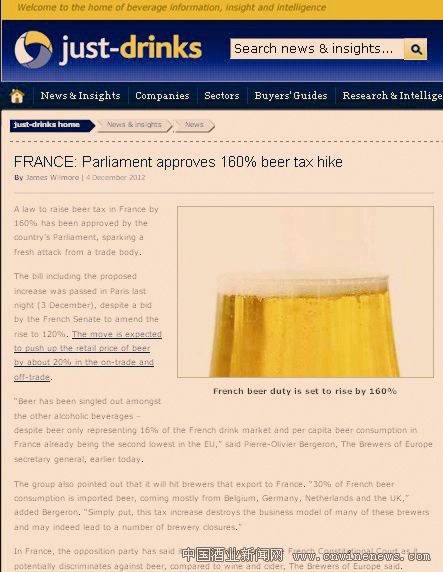12月3日,法国议会正式通过一项将啤酒税提高160%的法案,这一决议引发了贸易团体的新一轮抗议。 此前参议院曾力争将酒税的提高幅度定为120%但未果。这一法案将直接导致法国市场即饮和非即饮渠道的啤酒价格上涨约20%。 欧洲啤酒生产商称,此举对其打击很大,特别是对自2008年欧元区爆发经济危机以来经历过啤酒生产与消费分别下跌6%与8%厄运的啤酒企业而言,可谓“雪上加霜”。