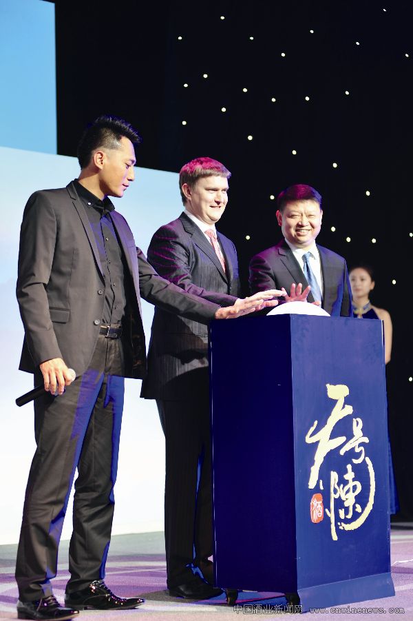 四川水井坊股份有限公司总经理柯明思先生(中)、四川水井坊股份有限公司副总经理许勇(右)与刘烨共同启动天号陈全新产品水晶球。