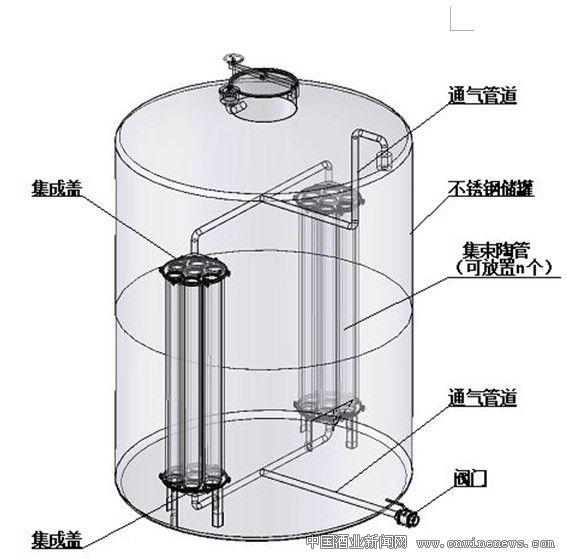 基于这些要求,我们研究了一种新型集束式陶管不锈钢罐,其结构如图1所示。这种贮罐的特点就是罐主体采用不锈钢制造,使罐具备不锈钢罐的一切优点,并在罐内安装集束式陶管或单根大直径陶管,陶管两端经由通气管道与外界大气相连,每根陶管都相当于一个小型陶罐,陶管内部充满空气,外部直接与酒液接触,与普通陶罐内盛酒、外部接触空气正好相反,但集束式陶管表面积更大,与空气和酒液接触更充分,因此陶质中金属离子的催化作用,空隙系统的氧化和吸附作用更加彻底,白酒的老化速率和老熟效果可达到甚至超过一般陶罐。