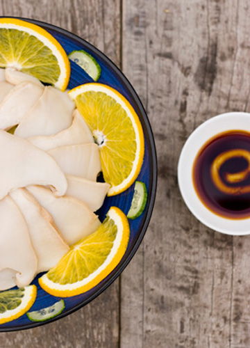 白灵菇用日本卤水腌制三四小时,味道清淡幽香,仿似带有螺旋藻的菇菌,菇身韧性高,有嚼劲,可以选择纯食或蘸点芥末酱油增添风味。