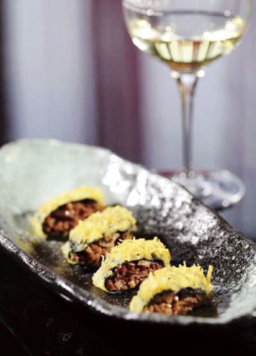 先把杏花菇、冬菇、火鸭丝炒熟,让各种食材的香味互相融入,以日本海苔包着馅料进行天妇罗式的油炸。外表干爽脆,内里多汁香气萦绕口腔,咸香诱人。