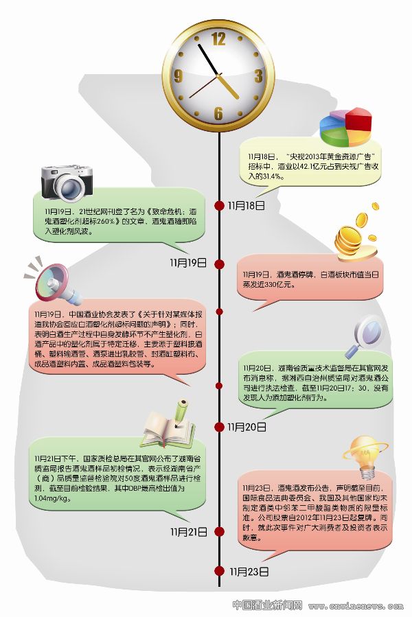 塑化剂风波72小时11月19日,一篇来自21世纪网的报道让酒鬼酒陷入塑化剂风波,并且在白酒行业迅速发酵。除了当事者酒鬼酒连续四天处于停牌状态外,A股市场中的白酒类股票也集体暴跌,19日当天白酒板块市值蒸发近330亿元。