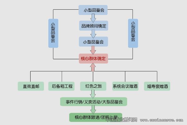 郎酒的团购中就专设了“小型品鉴会”项目。在新郎酒的《团购服务手册》中有明确注明:要分系统、按顺序依次开展,不要把很多不同单位的客户召集在一起,不便于沟通;尽量每次请一桌,便于照顾到每位客户并进行一对一的沟通;按照所请客户的档次或主推产品决定饮用酒;务必在适当时候告知客户新郎酒的零售价格;会后整理出客户资料,1~2天内对客户及时进行跟踪拜访、赠酒等以便达成团购。郎酒团购运作思路见图1。