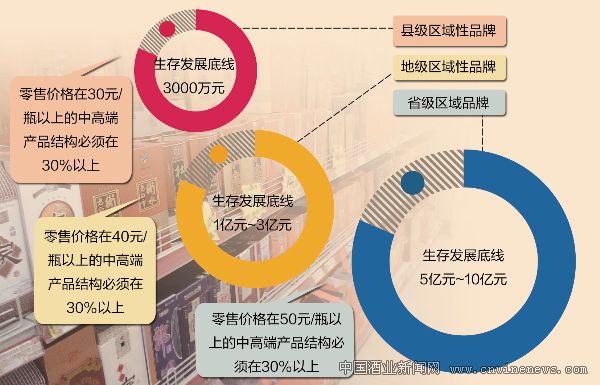 从市场覆盖来看,区域性品牌有三个层级,即立足于县级市场的区域性品牌,如安徽黄梅酒、山东邹平范公酒、济宁心酒、景阳冈酒、河北大名府酒、河南皇沟酒;立足于地级市场的区域品牌,如河北古顺酒、邯郸丛台酒、山东威海文登学酒、乾隆杯酒、安徽宣酒特贡等;立足于一个省级市场的区域品牌,如安徽高炉家酒、山东扳倒井酒、河北板城烧锅酒、河南仰韶酒、陕西太白酒等。