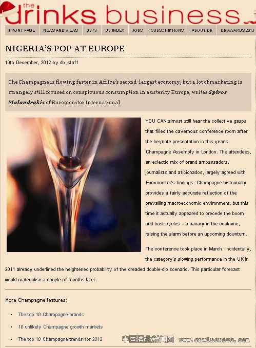 长期以来,香槟被视作经济发展的“晴雨表”,在欧洲的不利经济形势下,香槟的未来市场难言乐观文章来源华夏酒报。而尼日利亚等新兴市场的出现,将推动香槟的市场模式发生转变。