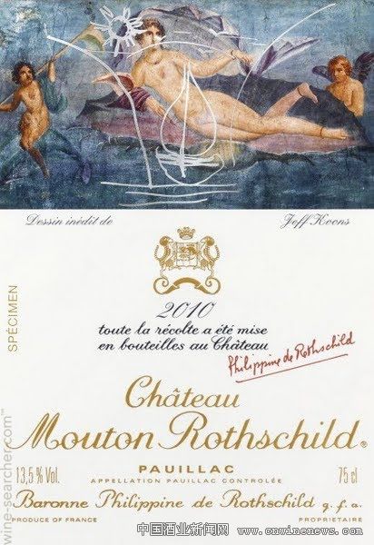 这是2010年份木桐酒标。该酒标选用了美国著名艺术家杰夫·昆斯(Jeff Koons)创作的一幅作品。这位当代艺术家将庞贝古城一幅描绘维纳斯诞生的壁画作为酒标的设计主题。图中描绘的是手持酒杯的维纳斯女神卧于贝壳之上,贝壳两边各有一位小天使,太阳之下的贝壳“轮船”正渐渐驶向一款精致的葡萄酒——2010年份木桐。