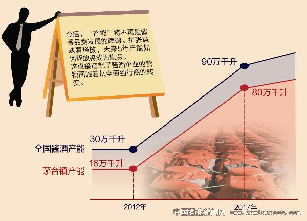 现阶段,酒类市场不是品牌竞争时代,而是品类竞争时代,酱酒不愁卖,有产能必然有销量。原因正是因为酱酒的生产周期长、投资大。酱酒一年酿造,三年储藏的行业标准颠古不破。但在过去的几年中,产能扩张成为酱香发展主旋律,其中茅台镇的产能将从2012年的16万千升/年,上升到2017年的80万千升/年;总体酱酒产量从目前的30万千升/年,扩张到2017年的90万千升左右/年,所以“产能”将不再是酱香品类发展的障碍。扩张意味着释放,未来5年产能如何释放将成为焦点。这直接造就了酱酒企业的营销必须面临从坐商到行商的转变。