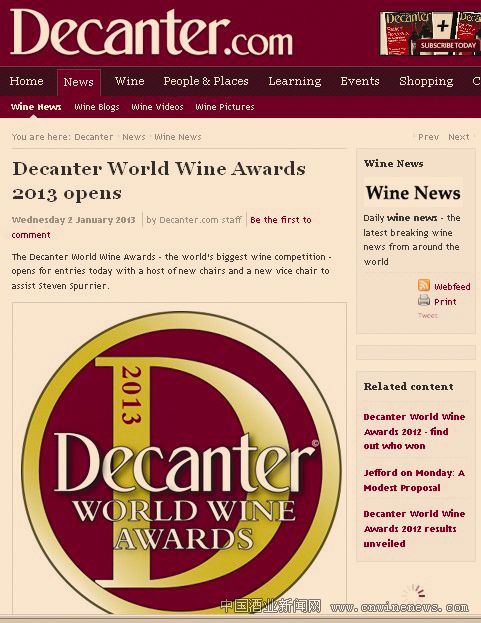 2013年品醇客世界葡萄酒大赛(The Decanter World Wine Awards,简称DWWA)已于1月2日开始正式接受报名,报名时间截至3月1日。