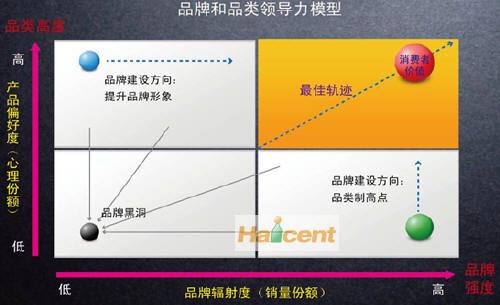 当前,对于如何建立品牌有两大不同的阵营?一种是以特劳特为代表的,“品类”塑造品牌,先有品类后有品牌;另一种则是以传统广告公司为代表的,以“形象”推动品牌,有了良好的品牌形象,你的产品就会畅销无阻。它们之间是相互独立,各自鼓吹的。实际上,这两者之间不是矛盾的,是相辅相成的,就如同一个品牌为消费者所提供的物理价值和情感价值。事实上,最强势的品牌,不是仅有超强品牌形象或是仅有好的产品那么简单,而是代表一个品类或主导一个品类,同时又有极高的品牌形象。也就是说,品牌地位=品牌强度×品类高度,那些在品类高度和品牌强度都占上风的品牌才有可能成为真正的市场领导品牌。很多时候,往往你通过一个创新的产品,从而创造了一个新的品类,但由于你的品牌形象低、美誉度差,常常是将这个品类创新拱手奉送给领导品牌。如iPod不是苹果的专利技术,但却成为了品类的代名词。因此,品牌的最佳发展轨迹是将品牌形象和品类利益产生关联,锁定在一起同时推动,最终成就领导品牌(如下图:品牌和品类领导力模型)。