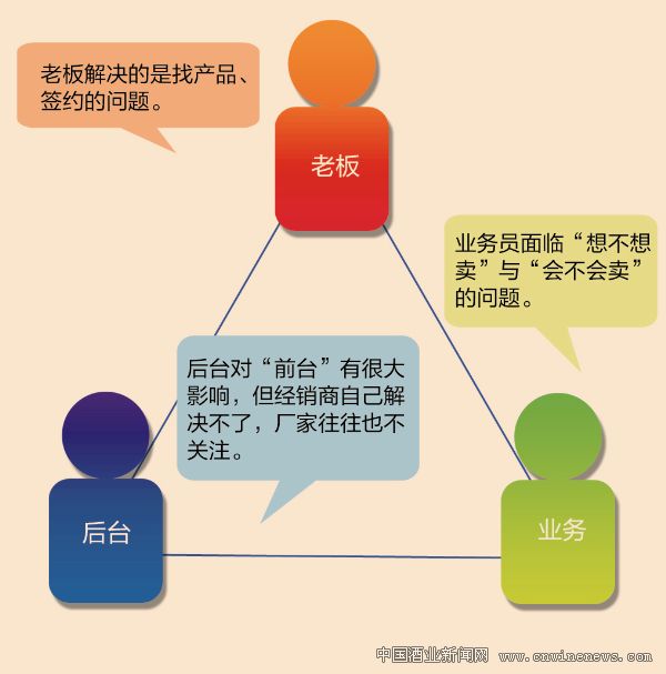 让我们来看一下上图中的三角形关系,其中,经销商老板解决的是找产品、签约的问题,而卖货的是经销商公司的业务员。